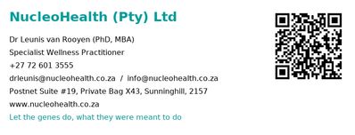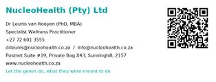 Facing health challenges, I turned to Dr Leunis van Rooyen who offered me specialist guidance towards holistic healing. His counselling improved my health significantly over the last year, addressing issues like high blood pressure, diabetes, and an underactive thyroid. I believe in the effectiveness of the NucleoHealth longevity-approach and recommend it to others, despite the product not being covered by medical aid. The continuous support and care provided by Dr van Rooyen have made a positive impact on my overall wellbeing.
